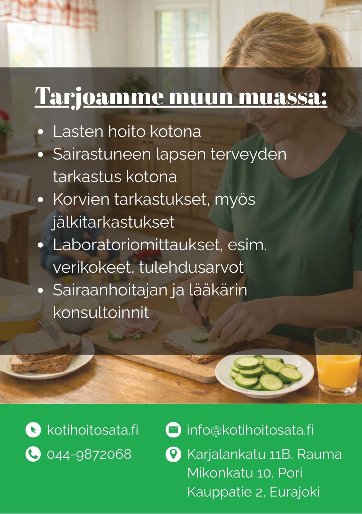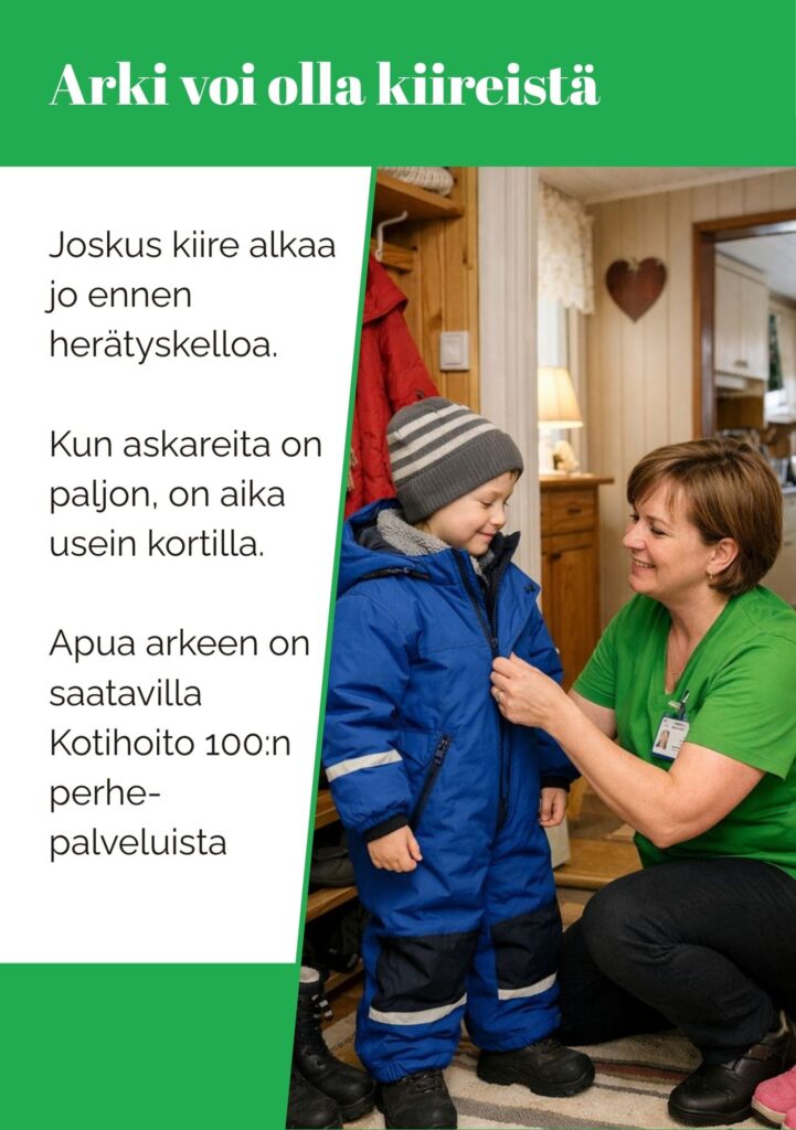 Kun arki käy raskaaksi, pienikin tuki tekee suuren eron. Tulemme avuksi kotiin lapsiperheille – jotta koti pysyy hallittavana, lapset saavat rauhallisen arjen ja vanhemmille jää aikaa palautumiseen. Palvelu räätälöidään perheen tilanteen mukaan, ja apua voi ottaa juuri sen verran kuin tarvitset.