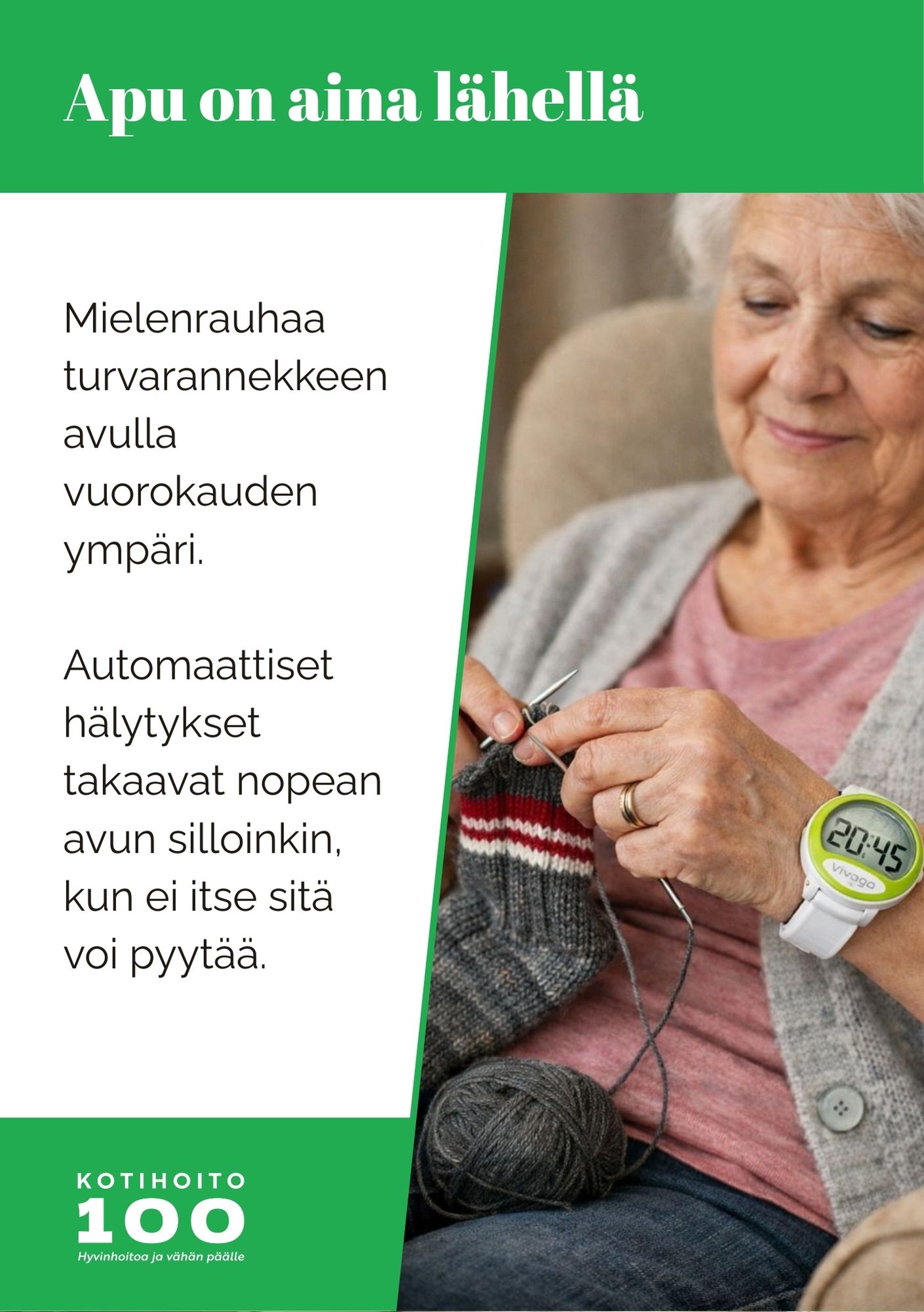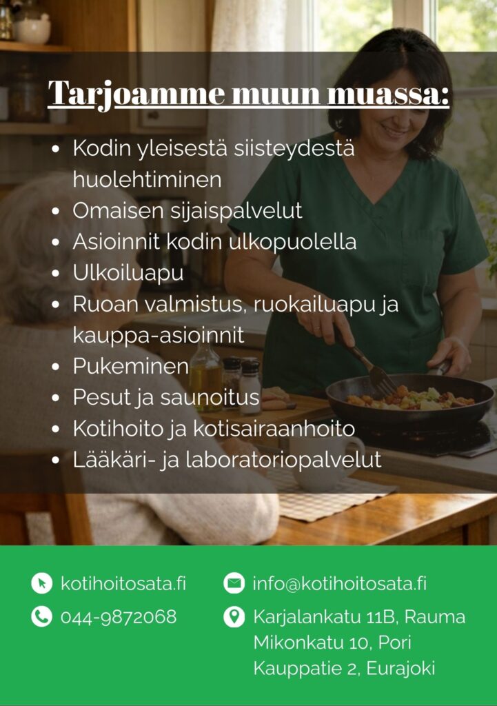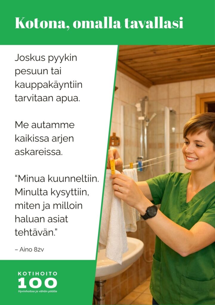 Kotihoito 100 tarjoaa arkeen konkreettista apua ja läsnäoloa. Tavoitteemme on, että kotona on hyvä olla – turvallisesti, arvokkaasti ja omien tottumusten mukaan. Palvelu räätälöidään aina asiakkaan tilanteeseen ja toiveisiin.